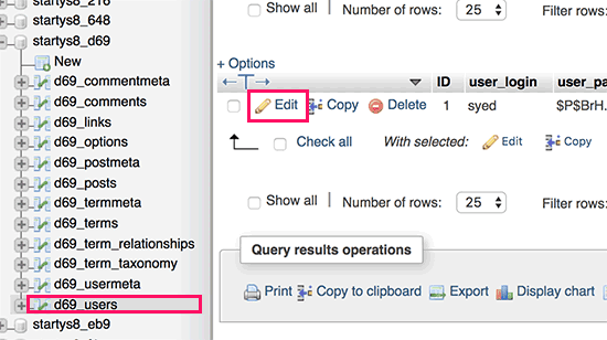 Tiếp theo, nhấp vào nút chỉnh sửa bên cạnh hàng mà người dùng đăng nhập khớp với người dùng bạn muốn chỉnh sửa. PhpMyAdmin bây giờ sẽ mở hàng người dùng trong một biểu mẫu.