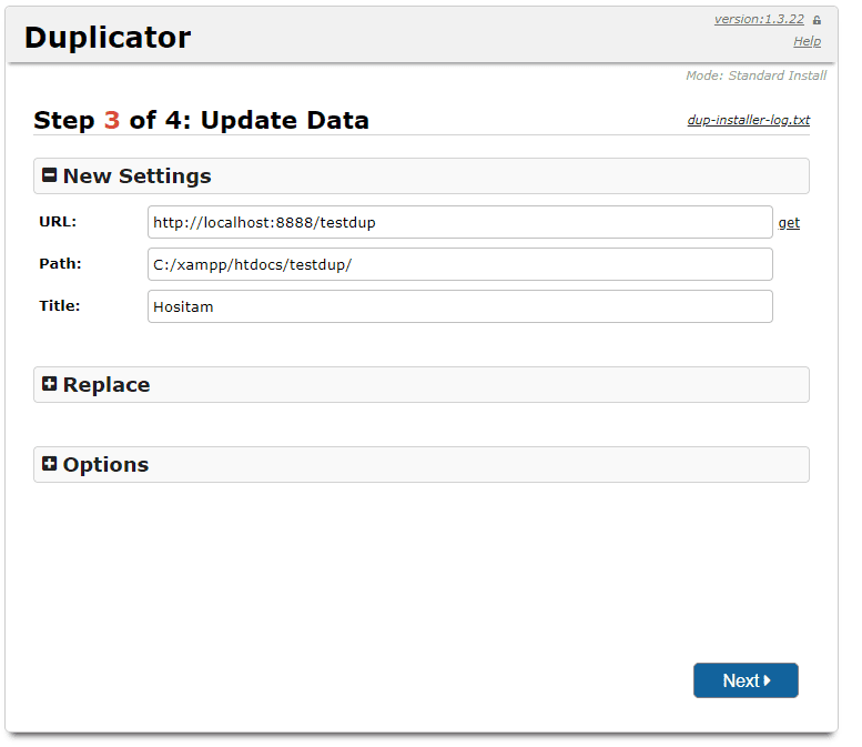 Nếu bạn cài test trên localhost, lúc này đường dẫn sẽ như sau: http://localhost:8888/testdup/installer.php