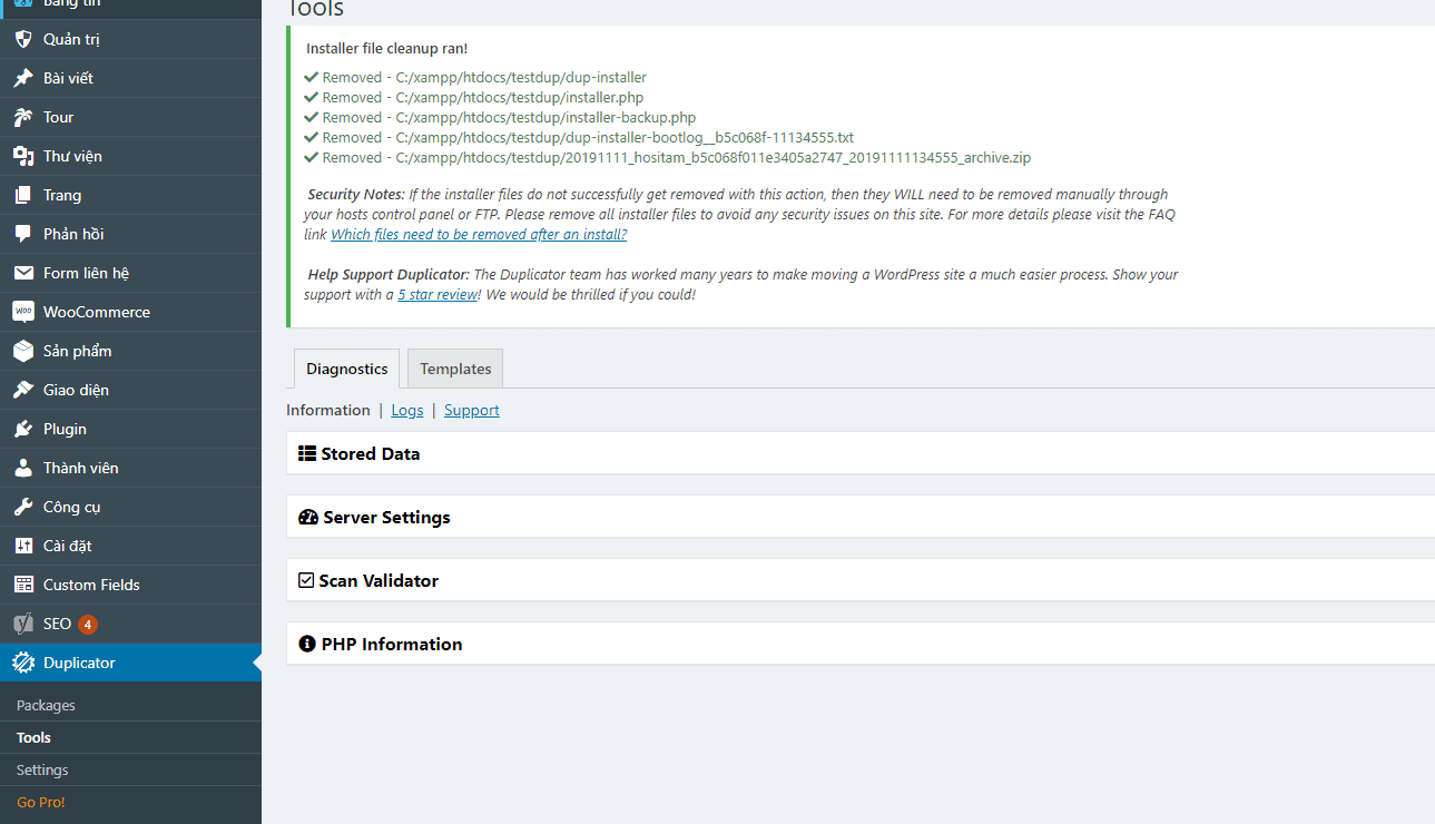 - Vào Duplicator -> Tools -> Cleanup -> ấn vào Delete Reserved Files để xóa bản backup kia đi để tránh kẻ xấu chạy file installer.php. (Nếu không làm bước trên)